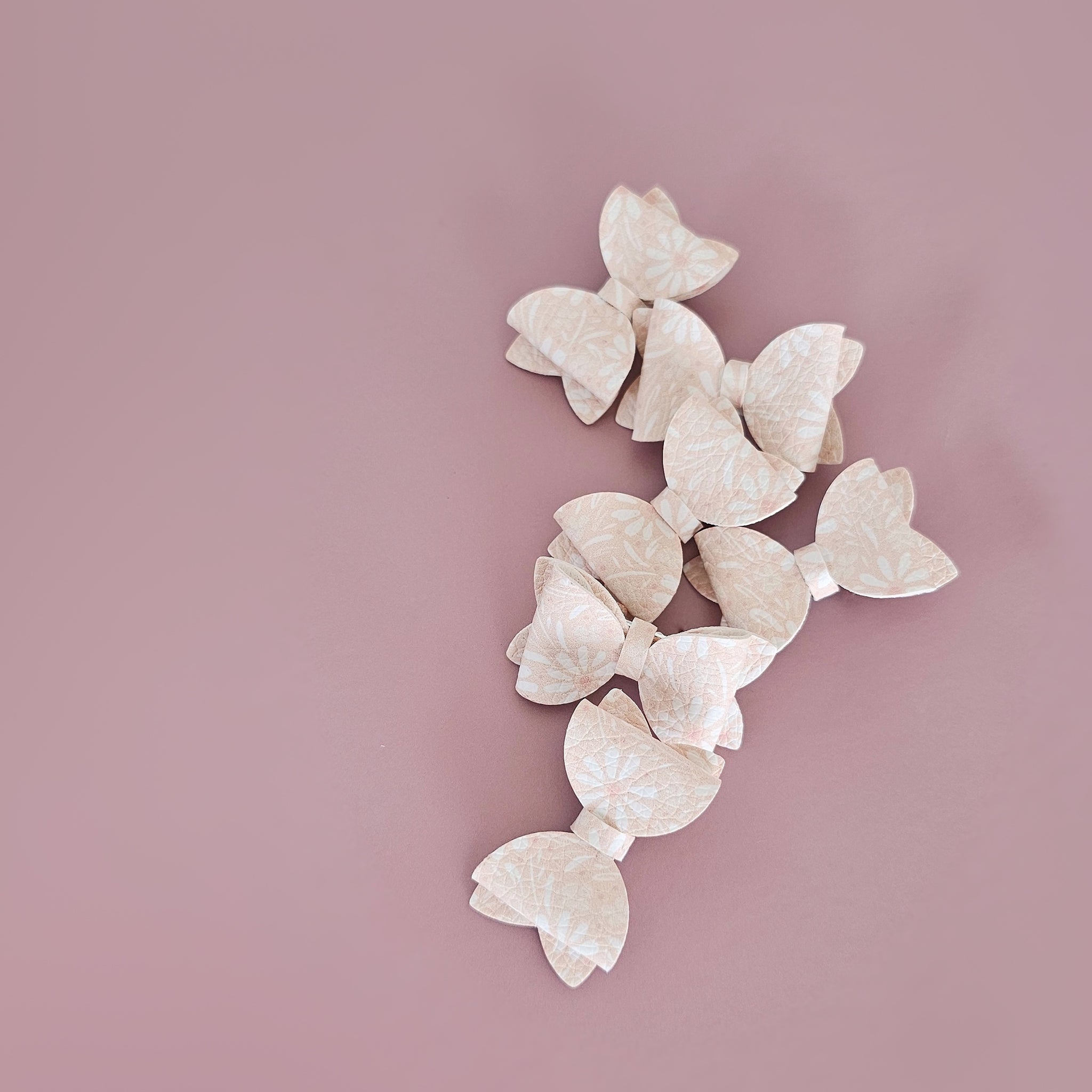 A darling floral print in soft peach tones; these bows are a petite size of just 3.9cm wide and made of a wipe-clean, soft faux leather fabric with a knitted reverse, so they're light weight in your LO's hair as well as being easy-care.