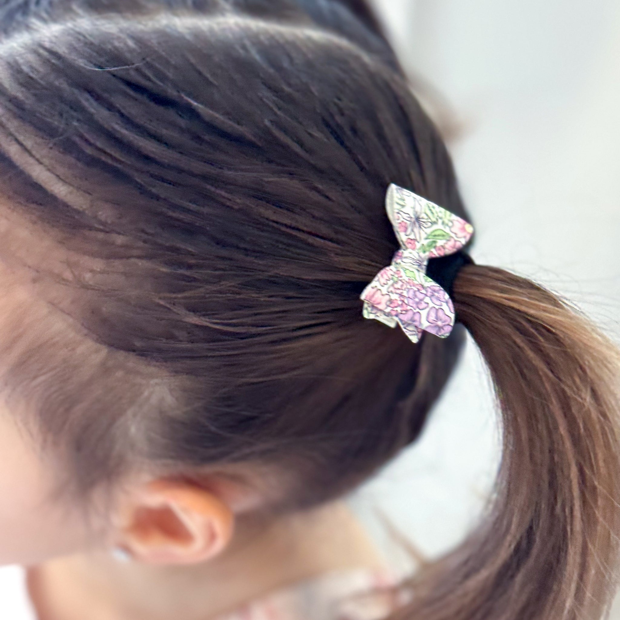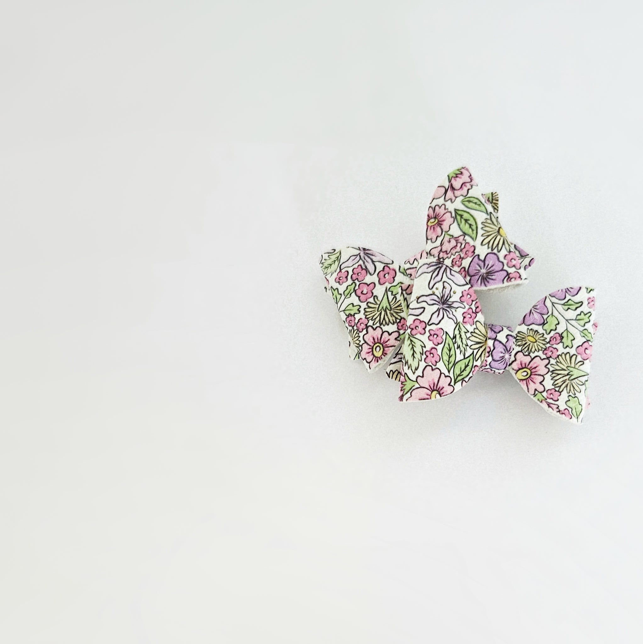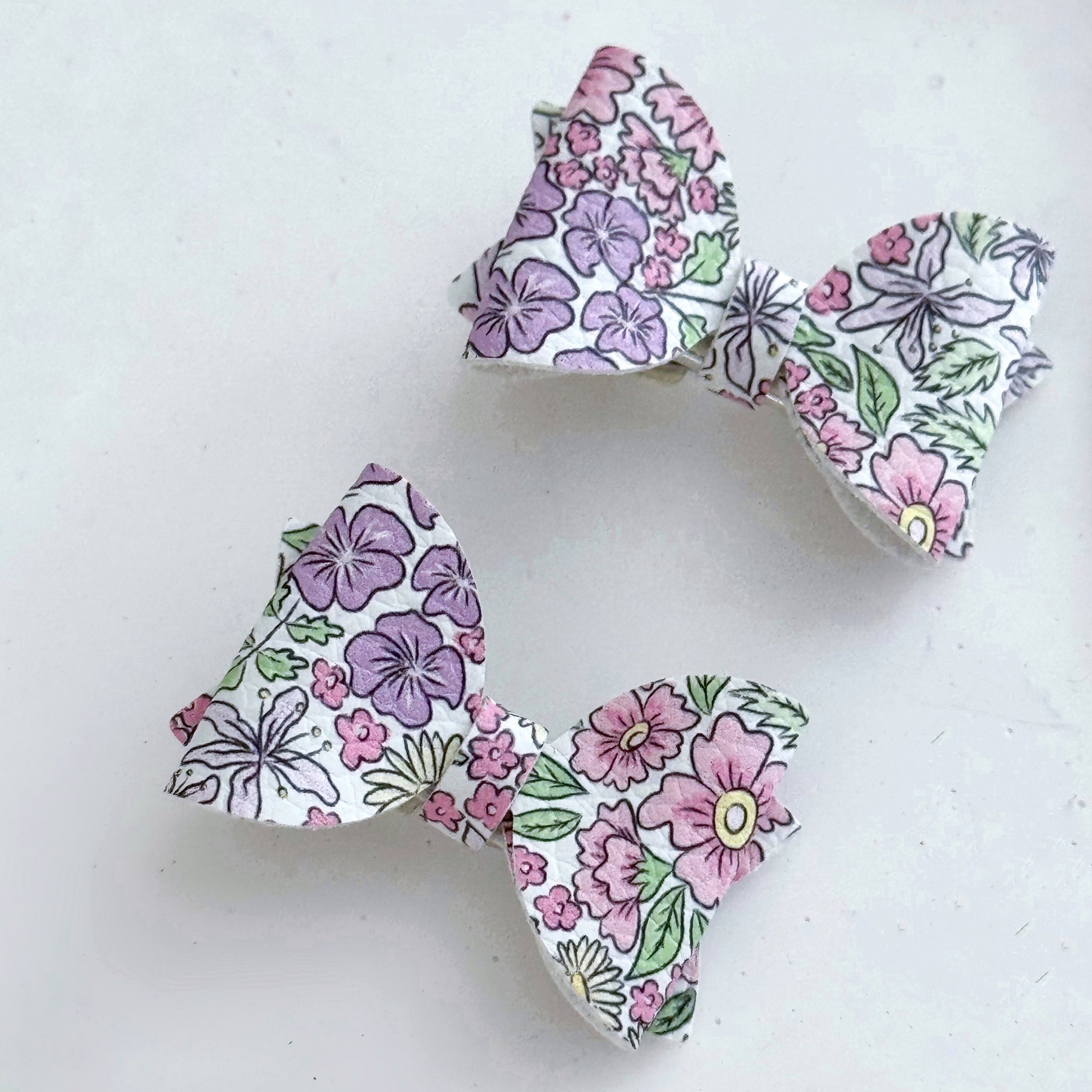 A duo itty-bitty bitty bows measuring just 3.5cm wide and made of a faux leather fabric with a knitted reverse. The colour palette of this floral print is perfect for spring, with shades of sweetpea pink, lavender, kelly green and soft yellow.