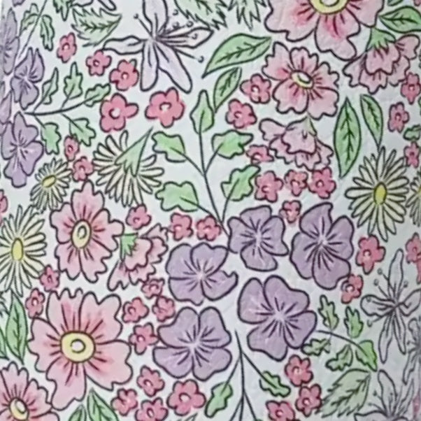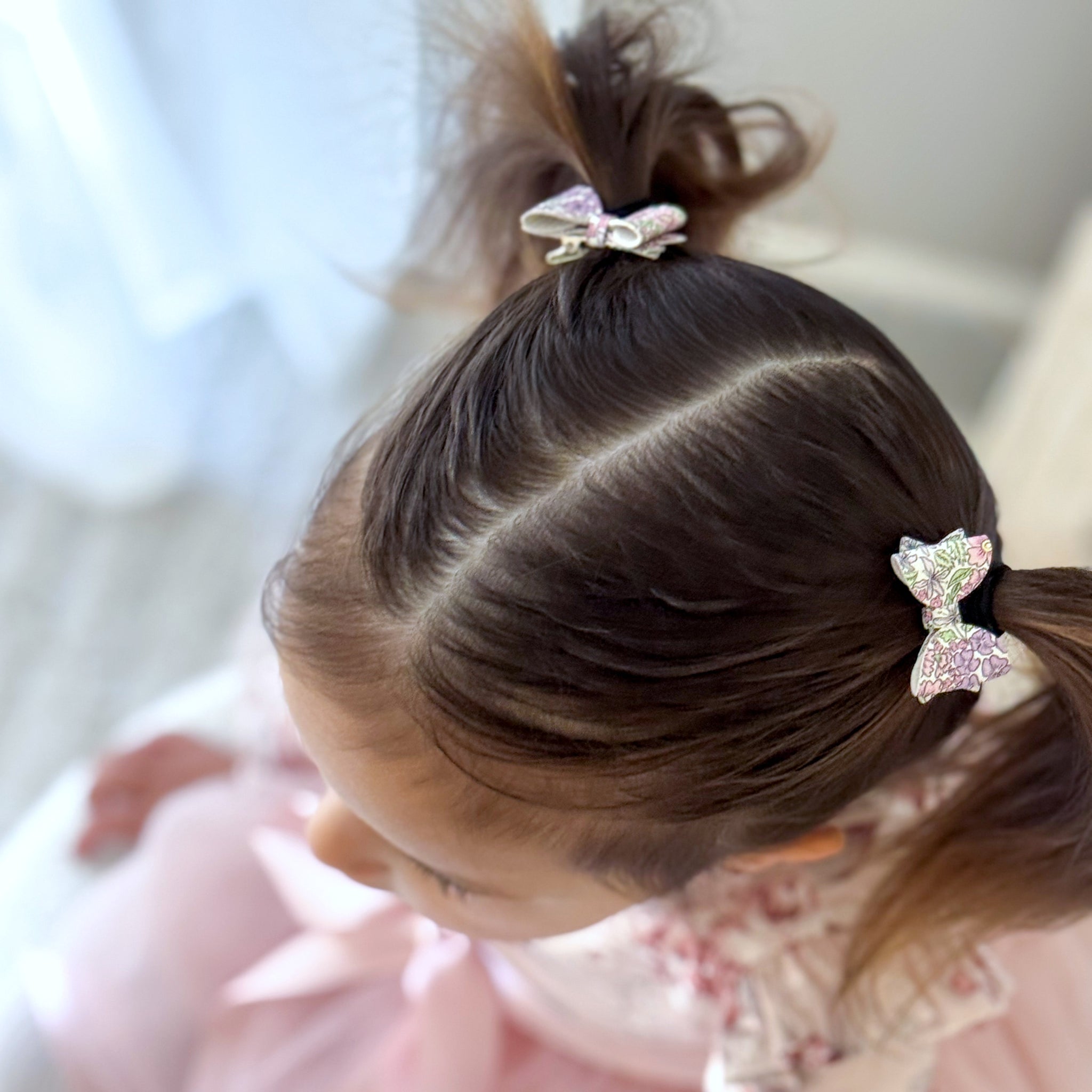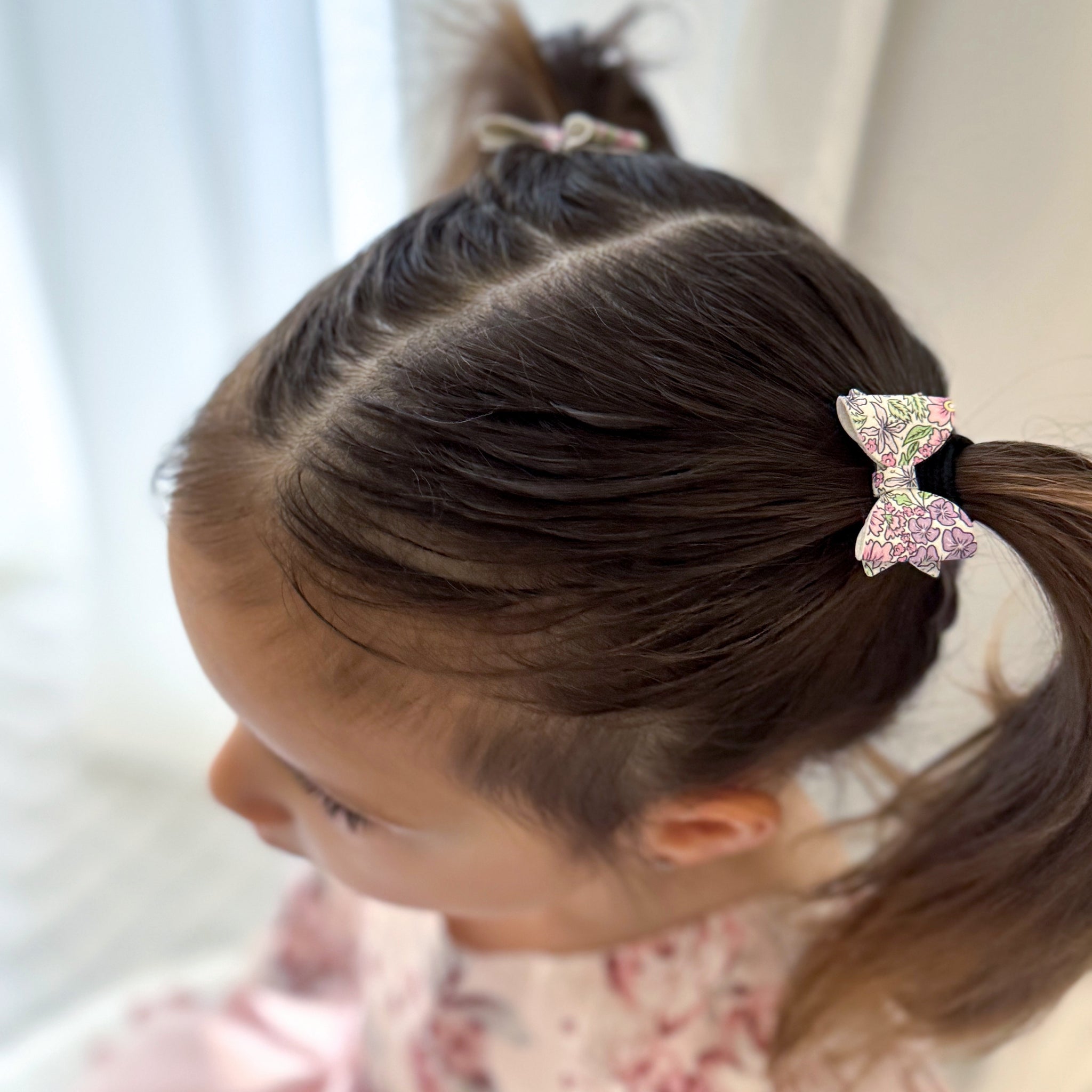 A duo itty-bitty bitty bows measuring just 3.5cm wide and made of a faux leather fabric with a knitted reverse. The colour palette of this floral print is perfect for spring, with shades of sweetpea pink, lavender, kelly green and soft yellow.