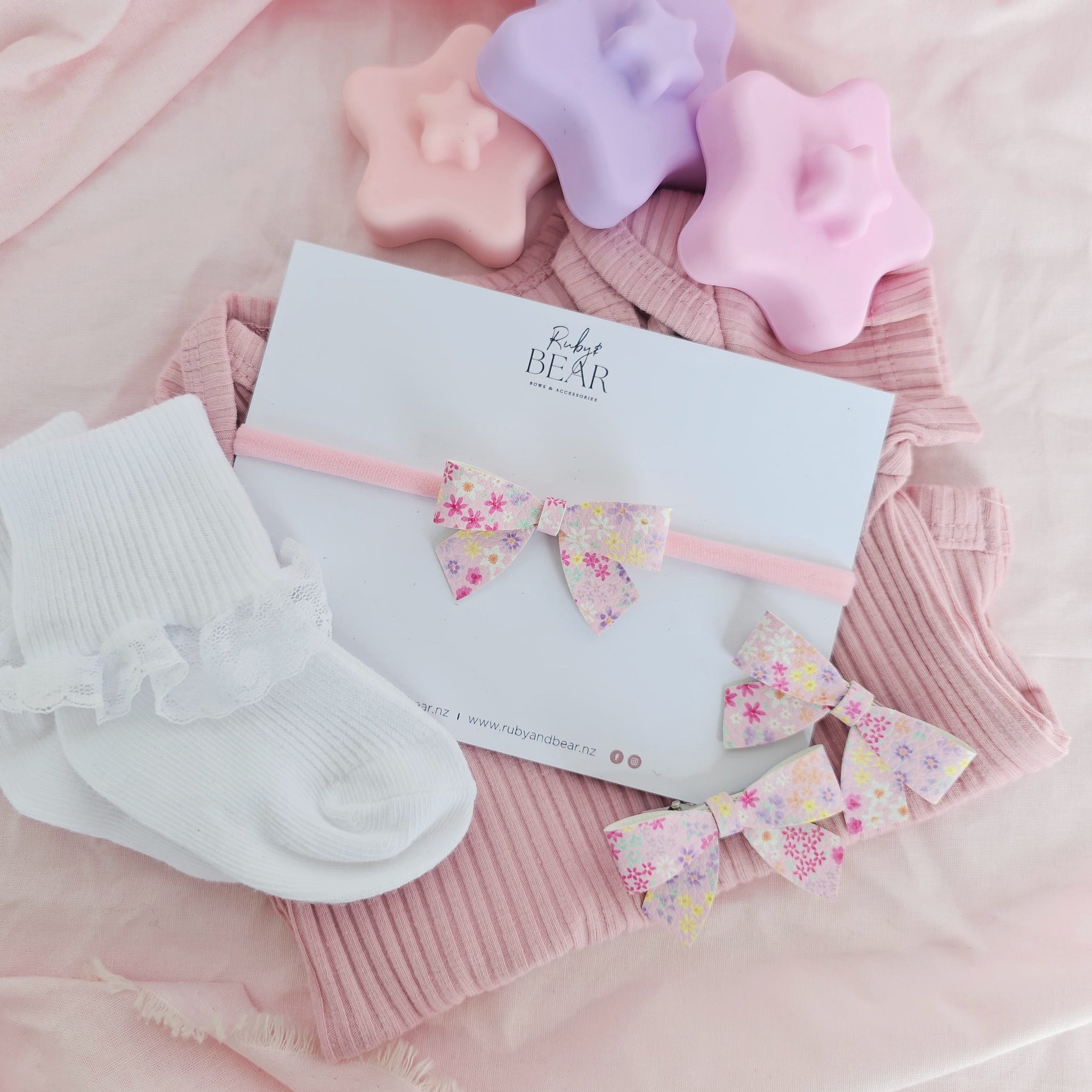 Our candy coloured Mim bows measure approximately 5.7cm x 3.8cm and come on 3.5cm ribbon wrapped alligator clips, with your choice of a left hinged setting or a right hinged setting. If your kiddo will wear these with pigtails, or would like one for each side of their head, I recommend ordering one of each hinge option.