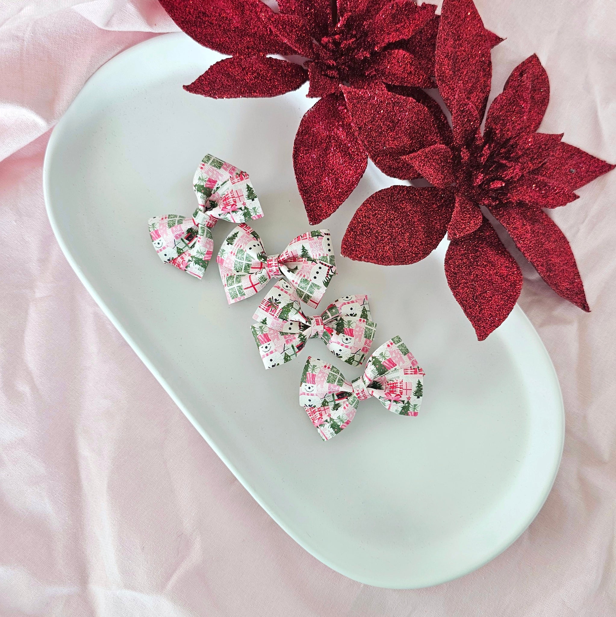 Candy pink gifts, sweet snowmen and Christmas trees are printed on a PU leatherette, and crafted into pinch bows measuring approximately 5cm x 3cm; perfect for styling those mini pigtails and up-dos.